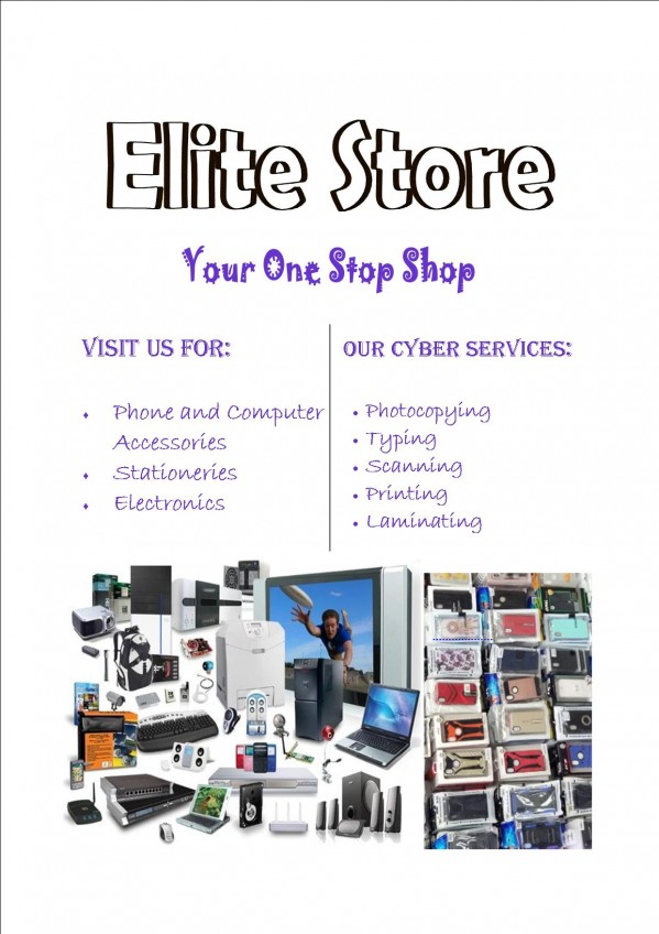 Elite Store deals with : Phone and Computer accessories Stationery Electronics General cyber Services